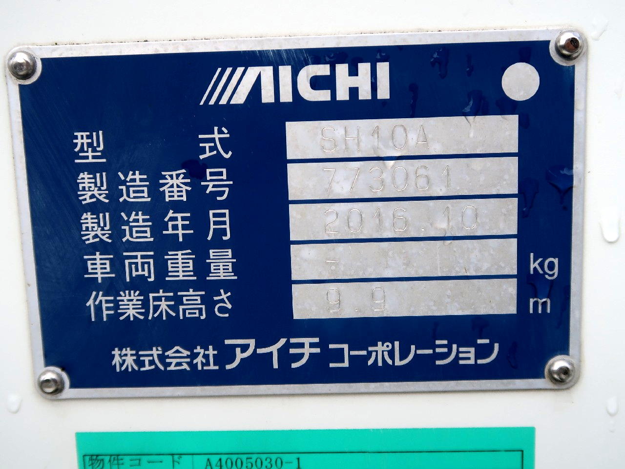 | 備考 | アイチ(SH10A 773061 作業床最大地上高9.9m 2016年10月) FRPバケット 走行充電付きバッテリ駆動型パワーユニット アワーメータ2526h ジャッキ敷板有 バックモニター 社外ナビ・ETC |