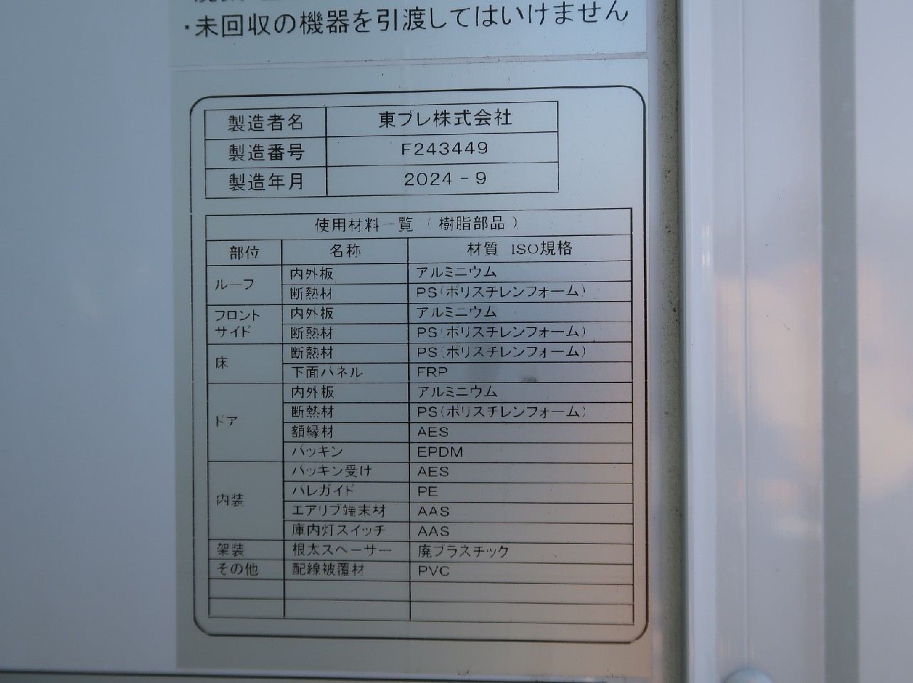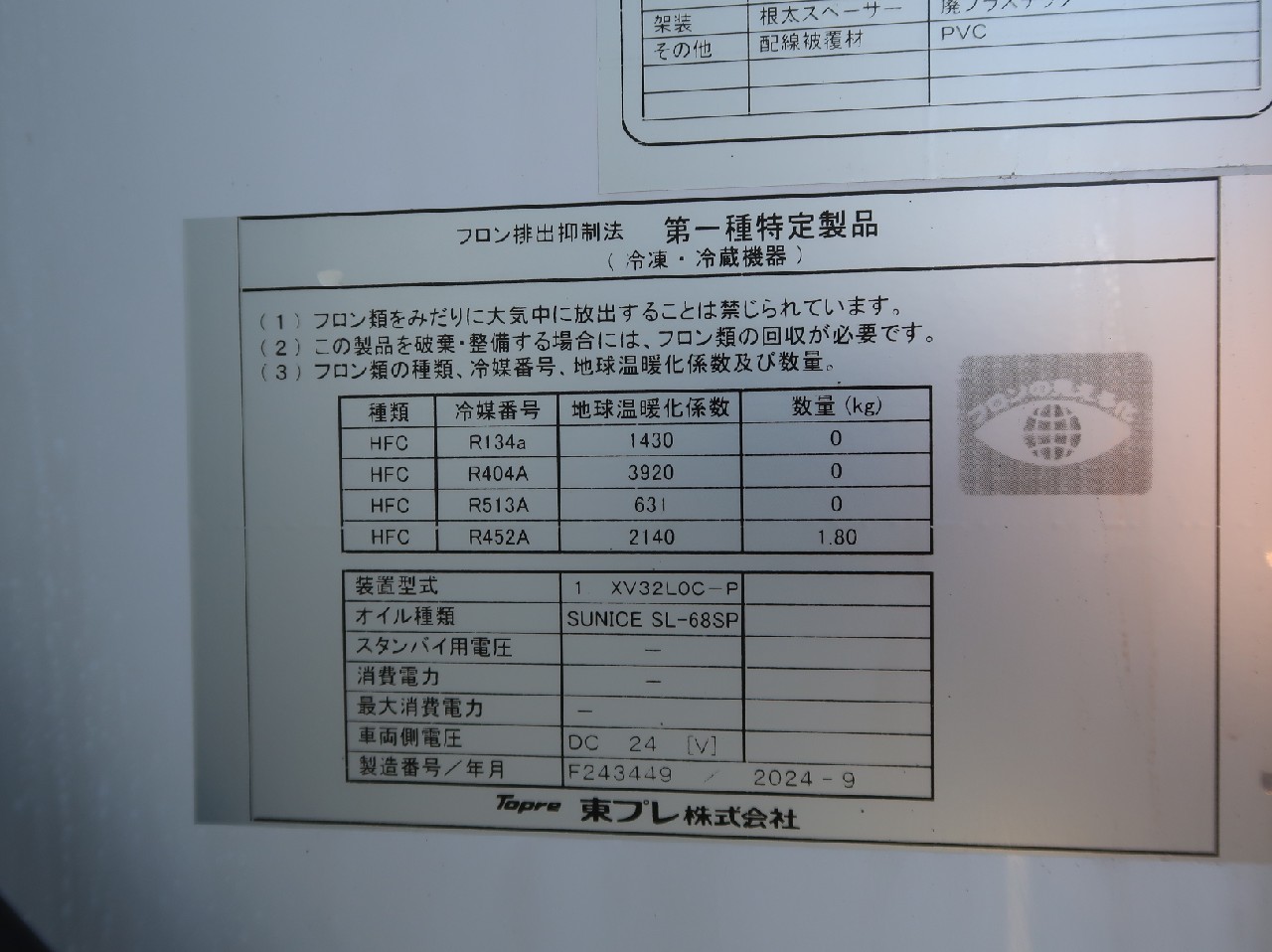 | 備考 | 東プレ(F243449 2024-9) サイドドア(スライド式) ラッシングレール2段 床アルミ縞板 (冷凍機)東プレ XV32L0C-P 低温 -30℃設定 バックモニター(ルームミラー型) |