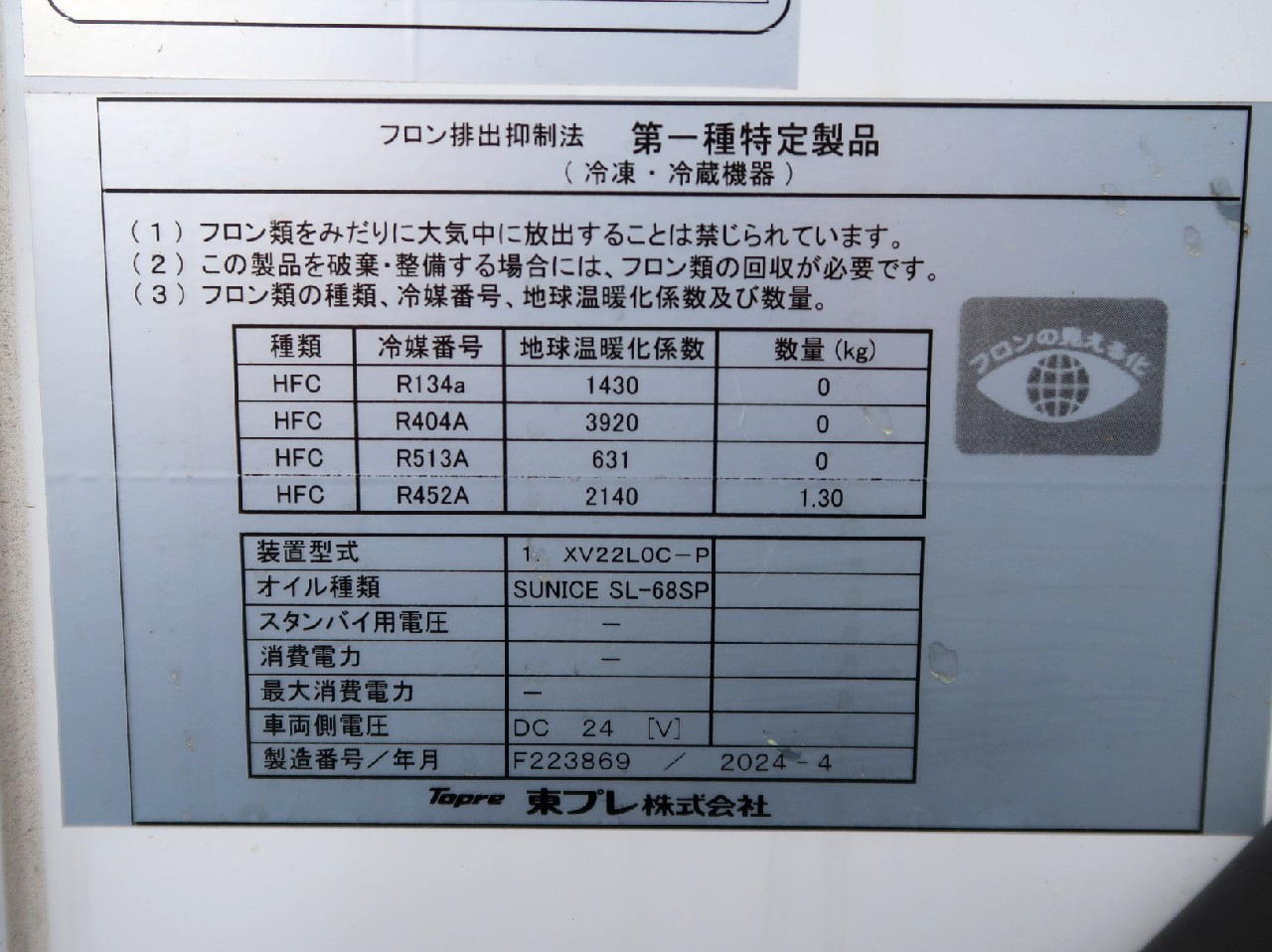 | 備考 | 東プレ(F223869 2024-4) サイドドア(スライド式) ラッシングレール2段 床アルミ縞板 (冷凍機)東プレ XV22L0C-P 低温 ‐30℃設定 バックモニター(ルームミラー型) |